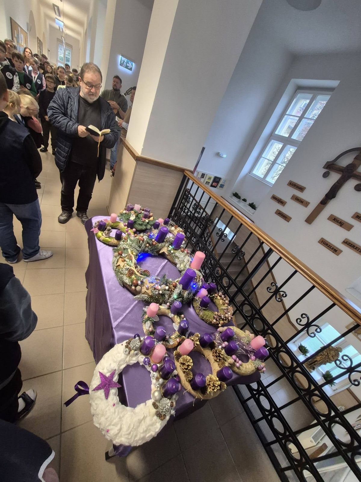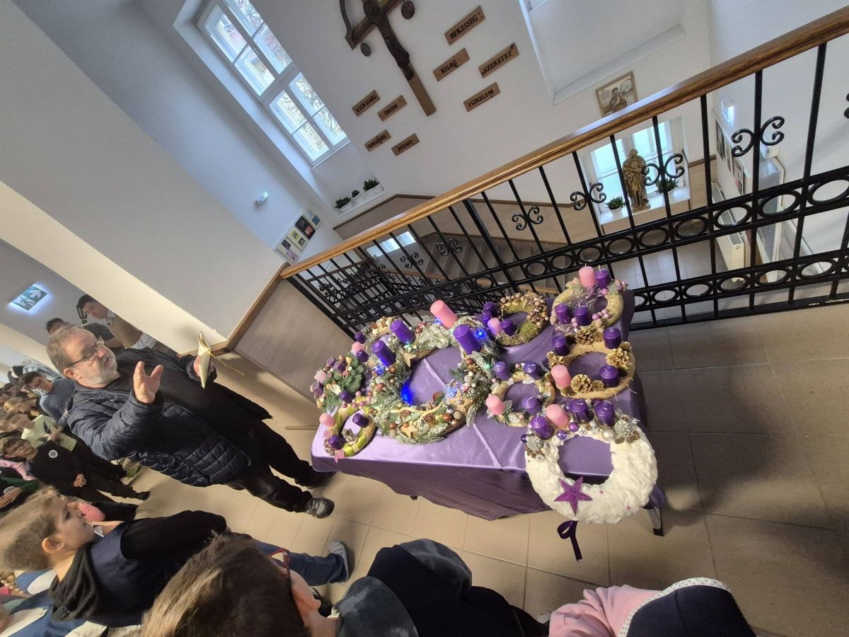 Minden osztály elkészítette az adventi koszorúját, és a hétindító ima után Tamás atya megáldotta. Az adventi időszakban a koszorú gyertyáinak fényénél kezdődhet a nap a reggeli imával.