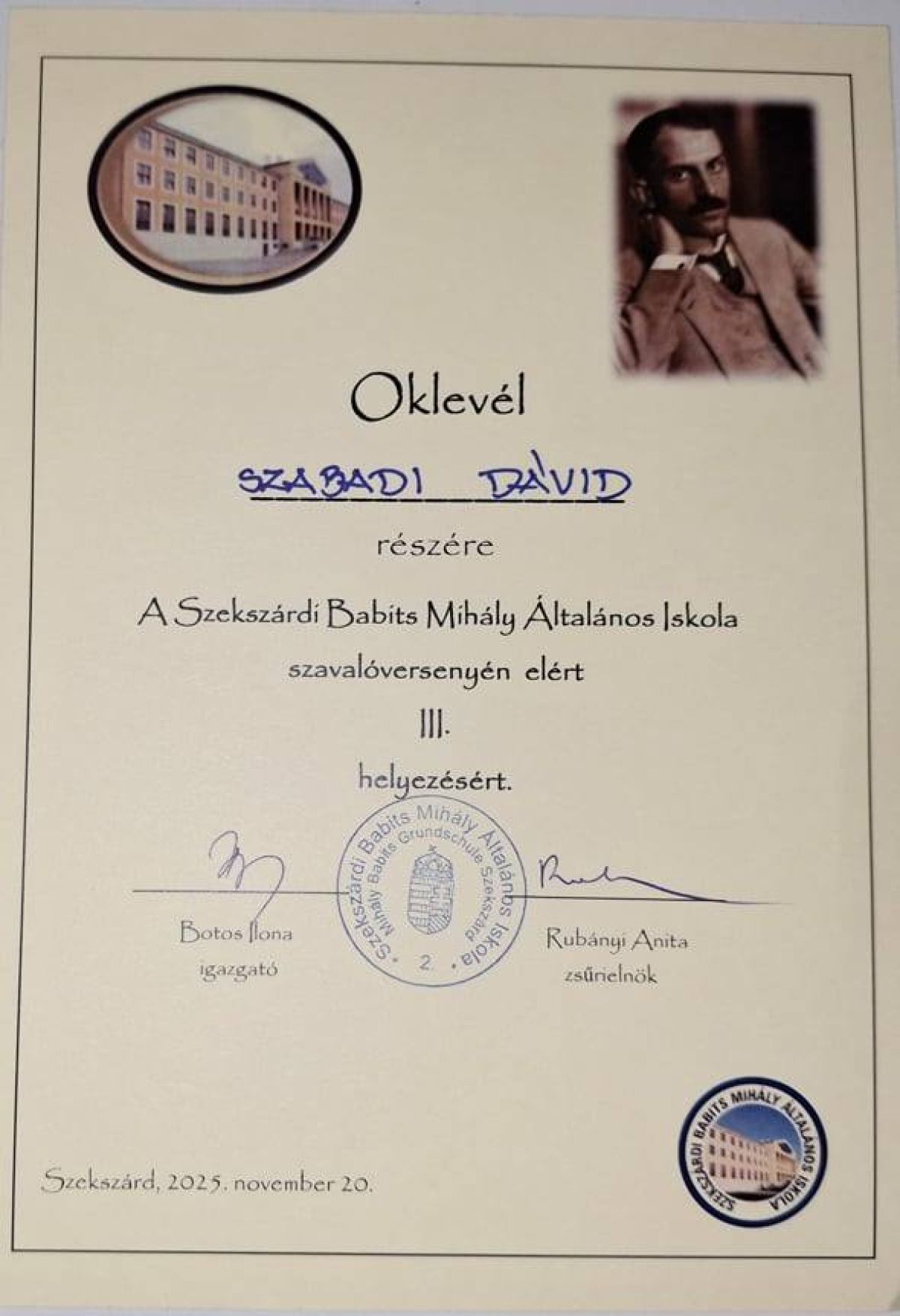 November 20-án Szekszárdon versmondó versenyt rendeztek a Babits Mihály Általános Iskolában az 5-8. osztályosoknak, melyen diákjaink szép sikert értek el.![]()