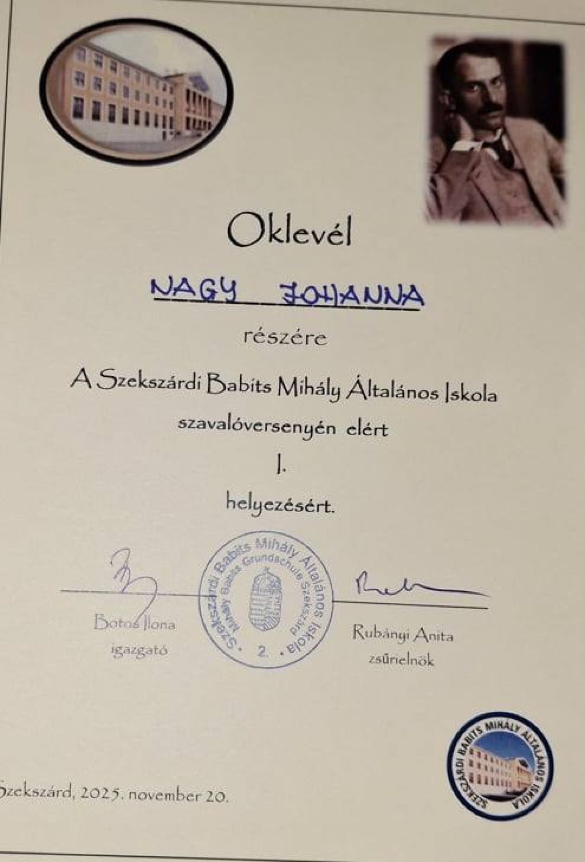 I. helyezés: Nagy Johanna (7. osztályos tanuló)