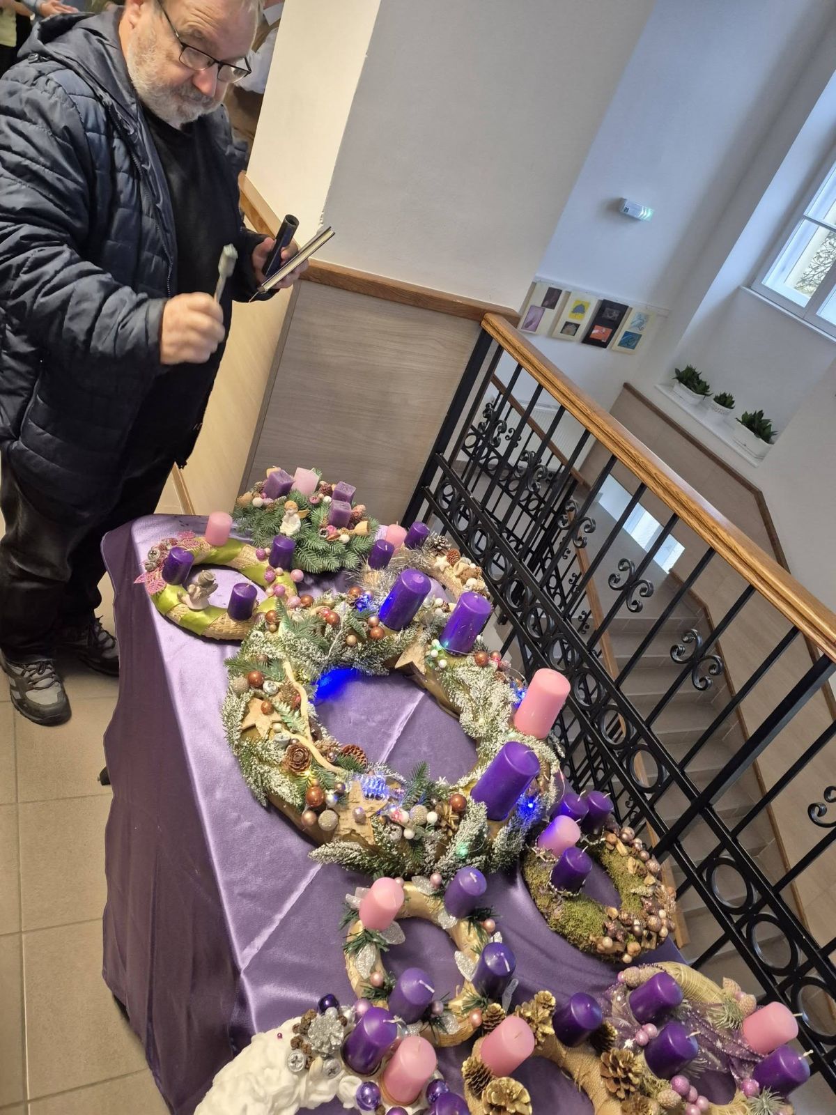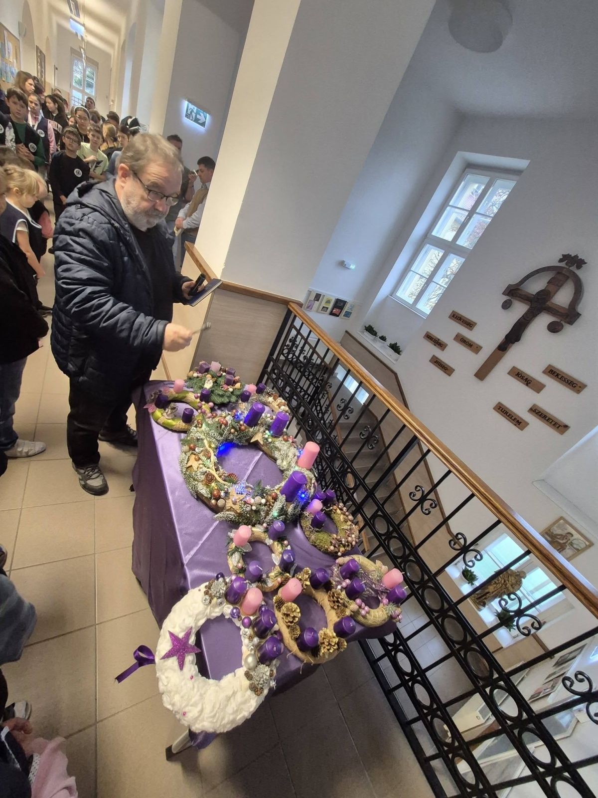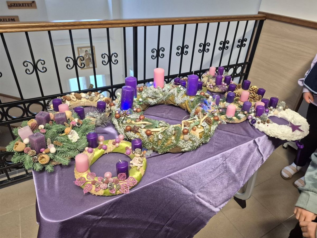 Minden osztály elkészítette az adventi koszorúját, és a hétindító ima után Tamás atya megáldotta. Az adventi időszakban a koszorú gyertyáinak fényénél kezdődhet a nap a reggeli imával.